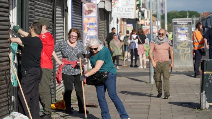 Members of the local community help to clear debris from the streets in Middlesbrough, north east England on August 5, 2024, following rioting and looting the day before. UK leader Keir Starmer warned far-right protesters on Sunday they would "regret" participating in England's worst rioting in 13 years, as disturbances linked to the murder of three children earlier this week flared across the country.