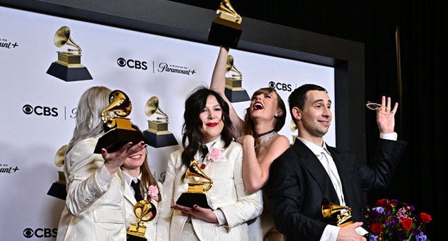 US singer-songwriter Taylor Swift winner of Best Pop Vocal Album and Album of the Year for “Midnights” poses with Julien Baker, Phoebe Bridgers, Lucy Dacus of US indie group boygenius hoding the Grammy Awards for Best Alternative Music Album for “The Record”, Best Rock Song for “Not Strong Enough” and Best Rock Performance for “Not Strong Enough” with singer Jack Antonoff (R) during the 66th Annual Grammy Awards at the Crypto.com Arena in Los Angeles on February 4. (Photo by Frederic J. Brown / AFP)
